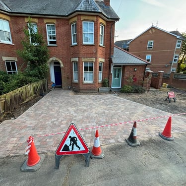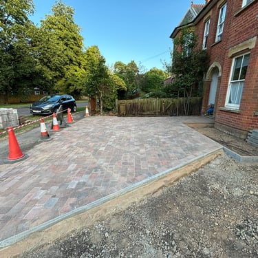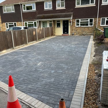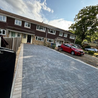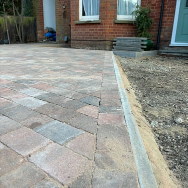 A recent driveway completed in farnbrough, using woburn rumbled trio and concrete path edgings, giving the best finish for this block paving driveway.