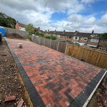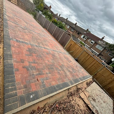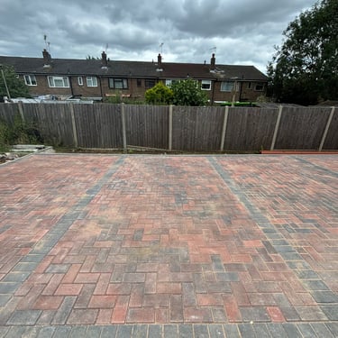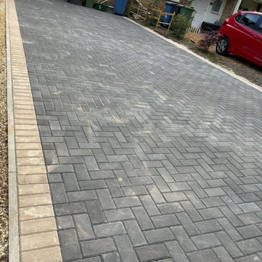 A small double block paving driveway with concrete path edging, featuring a charcoal border and brindle color blocks inside. A lovely, professional finish.